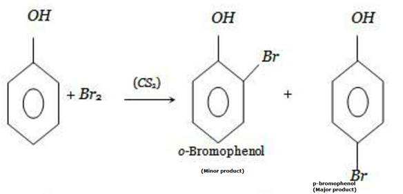 Now, if we treat phenol with carbon disulphide(CS2) at 273 K, the reaction is somewhat suppressed and instead of a tribromo derivative, a monobromo derivative is produced because CS2 is a less polar solvent as compared to bromine water. p-bromophenol is produced as a major product and o-bromophenol is also produced but as a minor product.