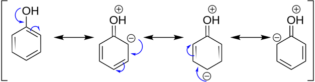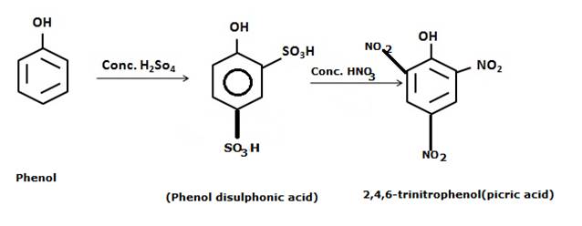 Phenols give 2,4,6-trinitrophenol(Picric acid) when it reacts with a mixture of conc. HNO3 and H2SO4. This is because of the production of negative charge on the three locations of the benzene ring due to the strong activating effect(+R effect) of the –OH group (due to the presence of lone pairs on Oxygen atom) on the benzene ring towards electrophilic reaction where the electrophile(-NO2 ) can easily attack.