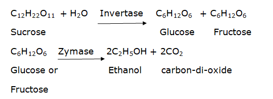 Molasses is a non-crystalline form of sugar which is obtained from mother liquor of sugar solution. Mother liquor can be prepared by crystallization of sugar from the sugar solution. This mother liquor contains about 50% sugar. It is then diluted to almost 10%.In this diluted solution, yeast is added and it is kept for 2 to 3 days. Yeast is a microorganism which produces the enzymes zymase and invertase. These two enzymes perform the following conversions given below: