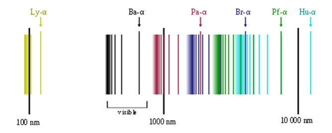 Besides the Balmer series, in the visible region, the spectrum of hydrogen also consists of the Lyman series in the ultraviolet region and 3 others in the infrared region – Paschen, Brackett and Pfund