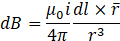 Here, dB is the magnitude of magnetic field element, μ0 is the permeability of free space and μ0= 4π × 10-7 T mA-1,dl is the length element, r is the distance between the current carrying wire and the required point.