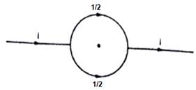 The current flows into the circular coil and using the KCL, splits equally between the two arms because both the arms are equal in length and ae made up of the same material.