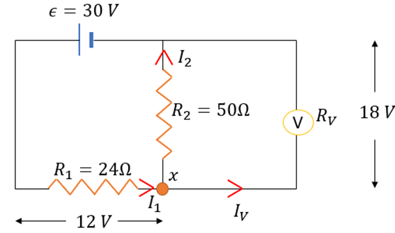 The voltmeter shown in figure reads 18 V across the 50 Ω resistor. Find the resistance of the voltmeter.
