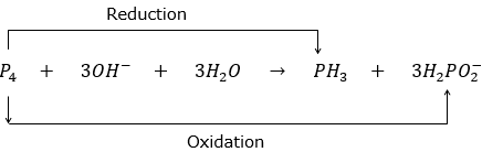 The above reaction shows that P4 undergoes reduction and oxidation simultaneously showing an example of disproportionation reaction. The oxidation number in P4 is zero as there are all elemental toms of phosphorous bonded in a pyramidal geometry. The oxidation reaction in results in the formation of Hypophosphite ion H2PO-2, which has an oxidation state of