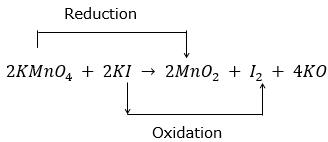 The above shows the reaction is a redox reaction, where Mn undergoes reduction from +7 to +4 and Iodine undergoes oxidation from -1 to 0. The maximum oxidation state that Mn can reach according to electronic configuration is +7. Thus as it cannot undergo oxidation it acts as oxidising agent and itself undergoes reduction, whereas Iodine undergoes oxidation from -1 to 0.