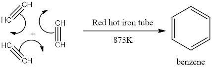 Acetylene can be cyclised using the intermolecular condensation method. That is, when it is treated at high temperature in red hot iron tube at 873K undergoes cyclic polymerization to give benzene. This can be a convenient way to start from a aliphatic compound to benzene. The reaction is given as: