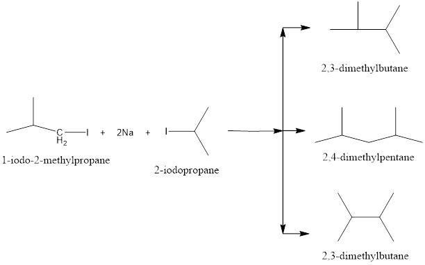 When mixture of 1-iodo-2-methylpropane and 2-iodopropane is treated with sodium it gives mixture of three products formed by intermolecular and intramolecular reaction as follows: