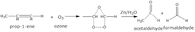 Propene when treatment with strong oxidation agent in acidic condition gives acetaldehyde and formaldehyde mixture as a product.