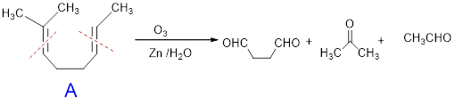 An unsaturated hydrocarbon ‘A’ adds two molecules of H2 and on reductive ozonolysis gives butane-1,4-dial, ethanal and propanone. Give the structure of ‘A’, write its IUPAC name and explain the reactions involved.