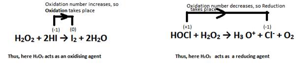 Similarly, H2O2 acts as a reducing agent in the second reaction as it decreases the oxidation number of Cl+ in HOCl from +1 to -1 in Cl-.