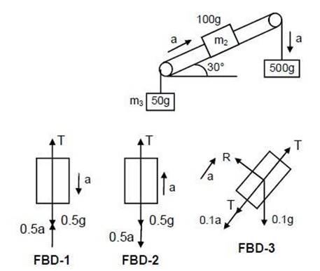 m1 = 100 g = 0.1 kg , m2 = 500 g = 0.5 kg , m3 = 50 g = 0.05 kg