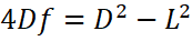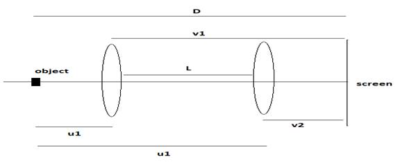 v is the length of the image formed, u is the size of the object placed on the principal axis, f is the focal length of the lens, M is the magnification, D is the distance between the object and the screen and L is the distance between the two position of lens which gives sharp image.