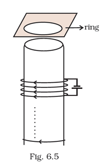 Consider a metal ring kept on top of a fixed solenoid (say on a cardboard) (Fig 6.5). The center of the ring coincides with the axis of the solenoid. If the current is suddenly switched on, the metal ring jumps up. Explain.