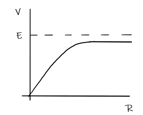 A cell of emf E and internal resistance r is connected across an external resistance R. Plot a graph showing the variation of P.D. across R, verses R.
