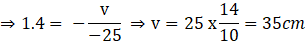 A man uses a concave mirror for shaving. He keeps his face at a distance of 25 cm from the mirror and gets an image which is 1.4 times enlarged. Find the focal length of the mirror.