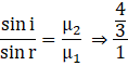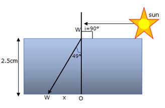A small piece of wood is floating on the surface of a 2.5 m deep lake. Where does the shadow form on the bottom when the sun is just setting? Refractive index of water = 4/3.