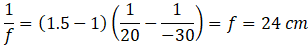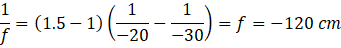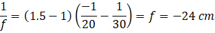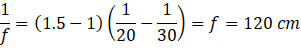 Lenses are constructed by a material of refractive index 1.50. The magnitudes of the radii of curvature are 20 cm and 30 cm. Find the focal lengths of the possible lenses with the above specifications.