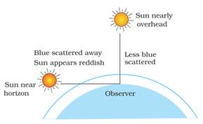 Draw a labelled diagram to show (i) reddish appearance of the sun at the sunrise or the sunset and (ii) white appearance of the sun at noon when it is overhead.