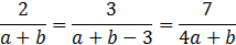 ⇒ 2a + 2b – 6 = 3a + 3b and 12a + 3b = 7a + 7b – 21