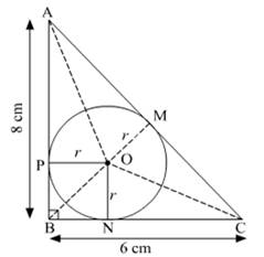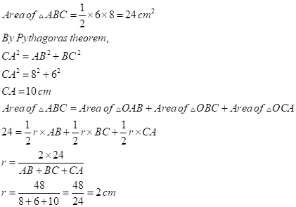 Let ABC be the right angled triangle such that angle B=90o, BC=6cm, AB= 8cm. Let O be the centre and r be the radius of the in circle.