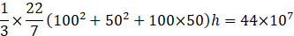 A reservoir in the form of the frustum of a right circular cone contains 44 × 107 litres of water which fills it completely. The radii of the bottom and top of the reservoir are 50 metres and 100 metres respectively. Find the depth of water and the lateral surface area of the reservoir. ![]()