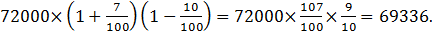 The population of a certain city was 72000 on the last day of the year 1998. During next year it increased by 7% but due to an epidemic it decreased by 10% in the following year. What was its population at the end of the year 2000?