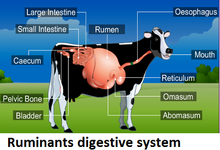 Ruminants have a large sac-like structure called rumen which is present in between the small intestine and large intestine. The cellulose of the food is digested by the action of certain bacteria present in rumen.