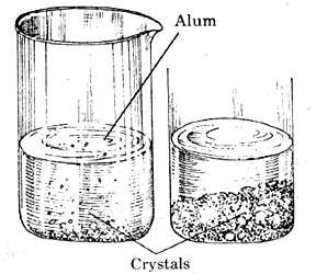 A cupful of water taken in beaker and a few drops of dilute sulphuric acid are added into it. The water is heated. When it starts boiling alum powder is added slowly while stirring continuously. Alum powder is added continuously till no more powder can be dissolved. The solution is filtered and allowed to cool down. Crystals of alum slowly form at the bottom of the beaker.