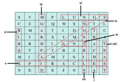 Given below is a square of letters in which are hidden different words related to respiration in organism. These words may be present in any direction--- upwards, downwards, or along the diagonals. Find the words for your respiratory system. Clues are given below the square.