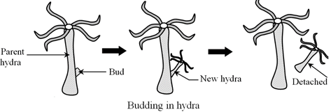 (ii) Budding: In budding, specific site of the parent body grows as an outgrowth called bud which then detaches and becomes a new organism. Example, Yeast and Hydra reproduce by budding.