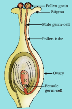 Fertilization begins when a pollen grain lands on the stigma of the carpel. Then it bursts open and forms a pollen tube. Pollen tube downwards through the style and finally reaches the ovule in the ovary. The male gamete present in the pollen grain moves through the pollen tube and fertilizes the ovum present in the ovule, i.e., fertilization takes place. The fertilization leads to the formation of zygote which later develops into an embryo. The following picture shows the fertilization in plants: