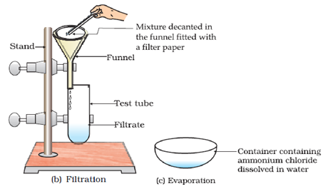 Ammonium chloride is soluble in water and is volatile at higher temperatures i.e. it evaporates at higher temperature and not at room temperature. This mixture can then be decanted in the funnel fitted with filter paper. The filtrate then contains ammonium chloride dissolved in water. It decomposes on heating to dryness.