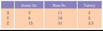 What information do you get from the Fig. 4.4 about the atomic number, mass number and valency of atoms X, Y and Z? Give your answer in a tabular form.