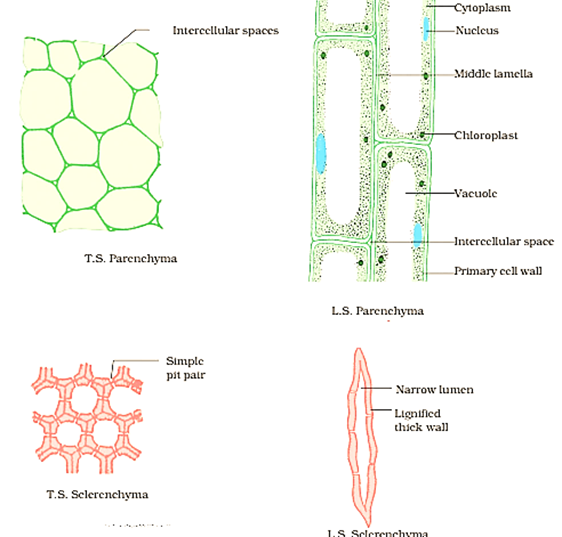 Differentiate between sclerenchyma and parenchyma tissues. Draw well labelled diagram.