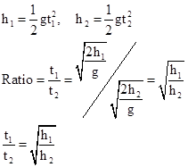 Two objects of masses m 1 and m2 having the same size are dropped simultaneously from heights h1 and h2 respectively. Find out the ratio of time they would take in reaching the ground. Will this ratio remain the same if