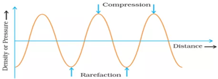 Draw a curve showing density or pressure variations with respect to distance for a disturbance produced by sound. Mark the position of compression and rarefaction on this curve. Also define wavelengths and time-period using this curve.