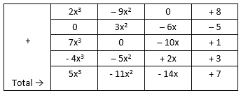 2x3 – 9x2 + 8, 3x2 – 6x – 5, 7x3 – 10x + 1 and 3 + 2x – 5x2 – 4x3