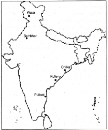 On the outline map of India mark and label the following lakes: Chilka, Sambhar, Wular, Pulicat, Kolleru.