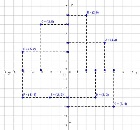 (vii) On the x−axis, take 5 units to the right of the y−axis; and then on the y−axis, take 4 units below the x−axis. Thus, we obtain the point G(5,−4)