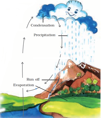 The water from the water sources on the surface of the earth evaporates and rise high up in the sky. As they reach height, they start cooling down and convert to tiny droplets of water. These water droplets join together to form heavy and dense clouds. When the clouds become heavy and cannot hold more water, the droplets fall on the earth in different forms such as rain, hail, frost, fog, sleet or snow. This process of falling down of water in different forms from the surface of the earth is called precipitation.