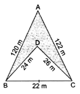 In the given figure ABC and DBC have the same base BC such that AB = 120m, AC = 122m, BC = 22m, BD = 24m and CD = 26m. Find the area of the shaded region. (Take = 10.25)