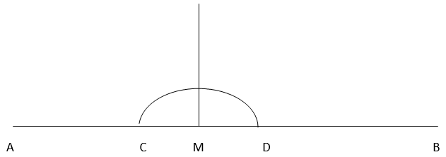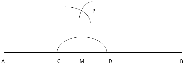 2. With M as centre and a convenient radius, draw an arc intersecting the line AB at two points C and D