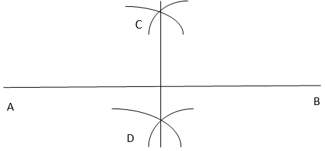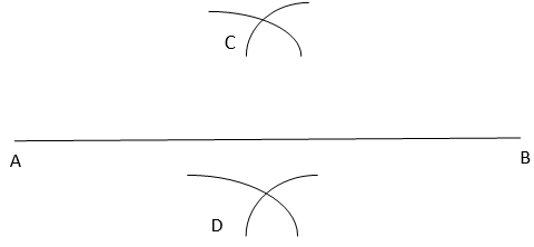 2. Taking A and B as centres and radius more than half of AB, draw two arcs on both the sides of which intersect each other at C and D.