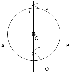 3. Taking A and B as centers and radius more than half of it, draw two arcs which intersect each other at P and Q.