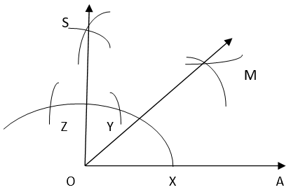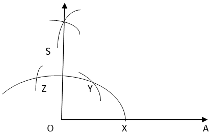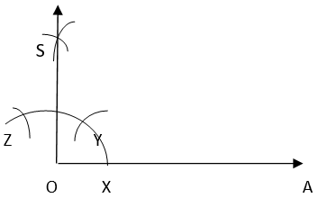 4. Taking Y and Z as centers and same radius, draw two arcs intersecting each other at S. Join OS. Thus, ∠SOA is required angle of 90°.