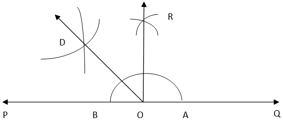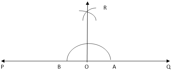 3. Taking A and B as centers and radius more than half of AB, draw two arcs intersecting each other at R. Join OR. Thus, ∠QOR = ∠POR = 90°.