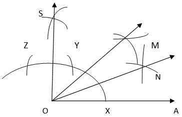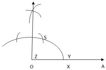 4. Taking Y and Z as centers and same radius, draw two arcs intersecting each other at S. Join OS. Thus, ∠SOA is required angle of 90°.