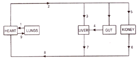 The following simplified diagram refers to the outline plan of the circulation of blood in a mammal. Study the diagram and write the number and the name of the blood vessel in each case as mentioned ahead.