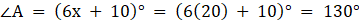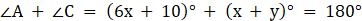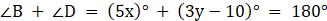 The angles of a cyclic quadrilateral ABCD are A = (6x + 10)°, B = (5x)°, C = (x + y)° and D = (3y – 10)°.