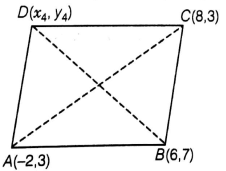 The fourth vertex D of a parallelogram ABCD whose three vertices are A( - 2, 3), B(6, 7) and C(8, 3) is